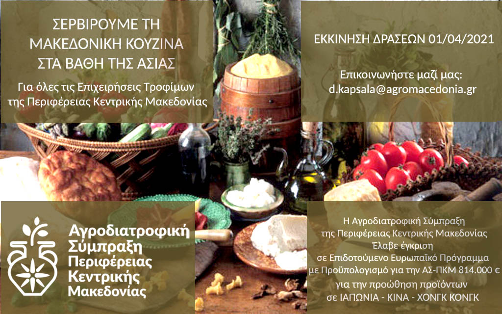 H Αγροδιατροφική Σύμπραξη της Περιφέρειας Κεντρικής Μακεδονίας/ΑΣ-ΠΚΜ ανακοινώνει την έγκριση για χρηματοδότηση του έργου “EXPERIENCE_EU” με θέμα “Promotion of Agricultural Products”, μέσα στα πλαίσια του προγράμματος προώθησης γεωργοδιατροφικών προϊόντων σε Τρίτες χώρες, της Ευρωπαϊκής Επιτροπής. Το τριετές έργο, με έναρξη τον Απρίλιο του 2021, θα υλοποιηθεί από την ΑΣ-ΠΚΜ, το Επιμελητήριο Επιχειρήσεων Τροφίμων της Σλοβακίας/FOOD CHAMBER OF SLOVAKIA και συντονιστή εταίρο την Ομοσπονδία Βιομηχανιών Τροφίμων και Ποτών της Ισπανίας/SPANISH FOOD AND DRINK INDUSTRY FEDERATION. Ο συνολικός προϋπολογισμός του έργου είναι 2.580.918. Το αναλογούν ποσό για την ΑΣ-ΠΚΜ είναι της τάξης των 814.669,47 ευρώ για τις δράσεις που θα αναπτυχθούν στην Κίνα, Ιαπωνία και Χoνγκ-Κονγκ.